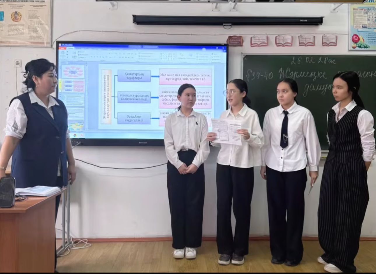 №58 жалпы орта білім беретін мектебінің тарих пәнінің мұғалімі Майликараева Аманкуль 26.02.2026 ж 7"Б" сыныбында Қазақстан тарихы пәнінен ашық сабақ өтті. Сабақтың тақырыбы: "Жәрмеңке саудасының дамуы." Сабақ барысында ЖИ қолданып, топтық, жұптық, жеке жұмыстар жасалды.